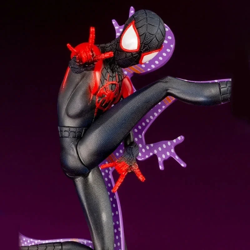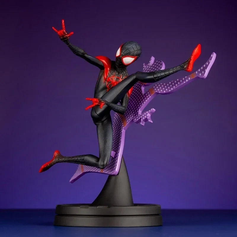 Features a fixed-pose statue of Miles Morales or other Spider-Verse characters (varies by version)